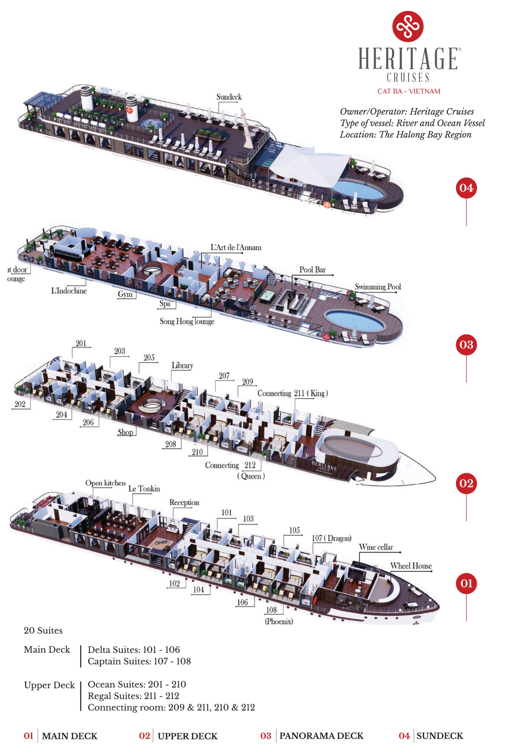 Heritage Cruises aims to offer each guest the opportunity to create their own memories with exquisite cuisine, 24-hour room service and fun activities. Dine whenever and wherever you wish, and choose from massage options.