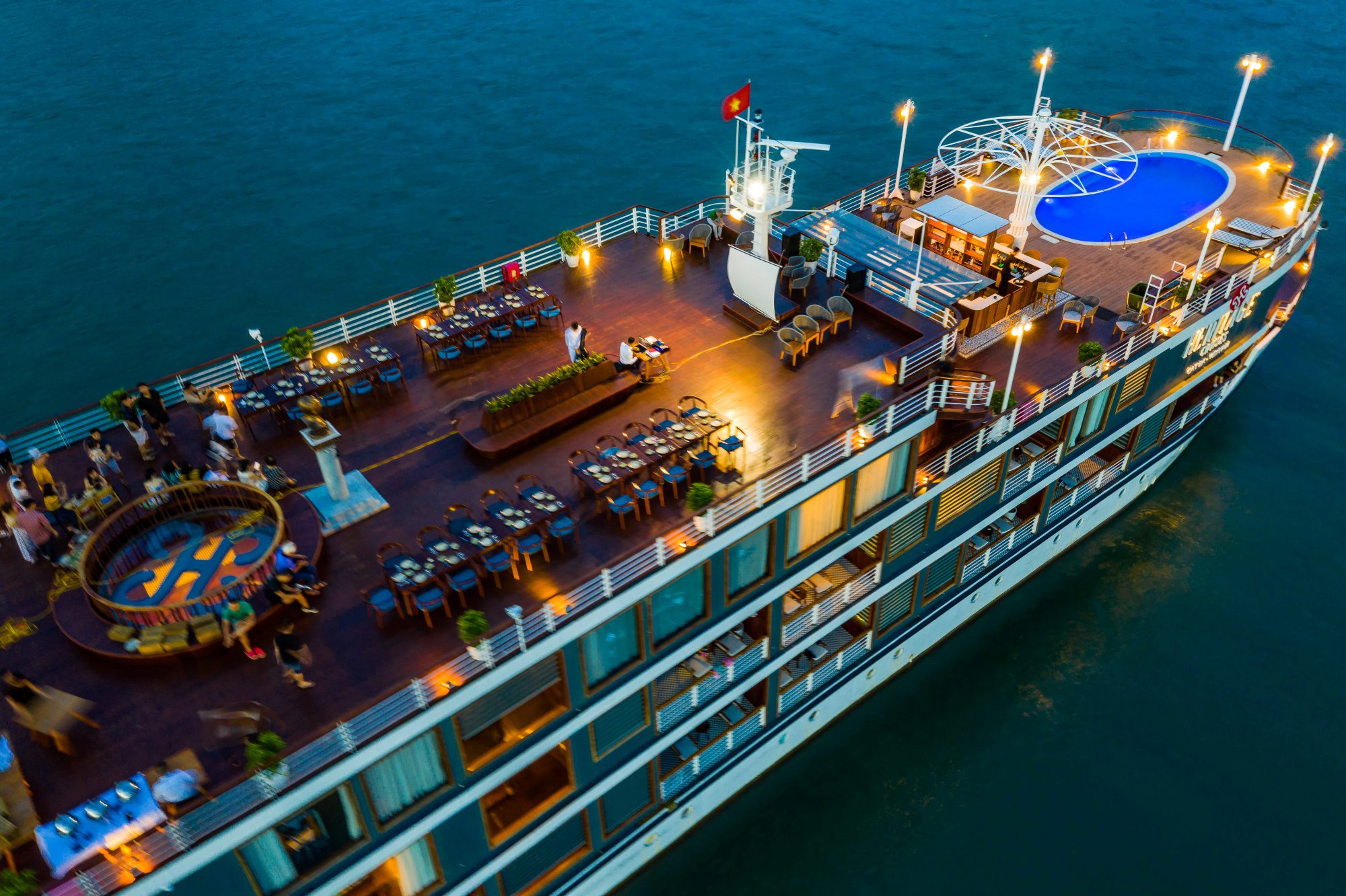 Bay’s panoramas. A few minutes into the cruise guests are invited to taste Vietnamese dishes at the restaurant. The next highlight is Ba Trai Dao beach or the Tra Bau area to enjoy kayaking or swimming.
