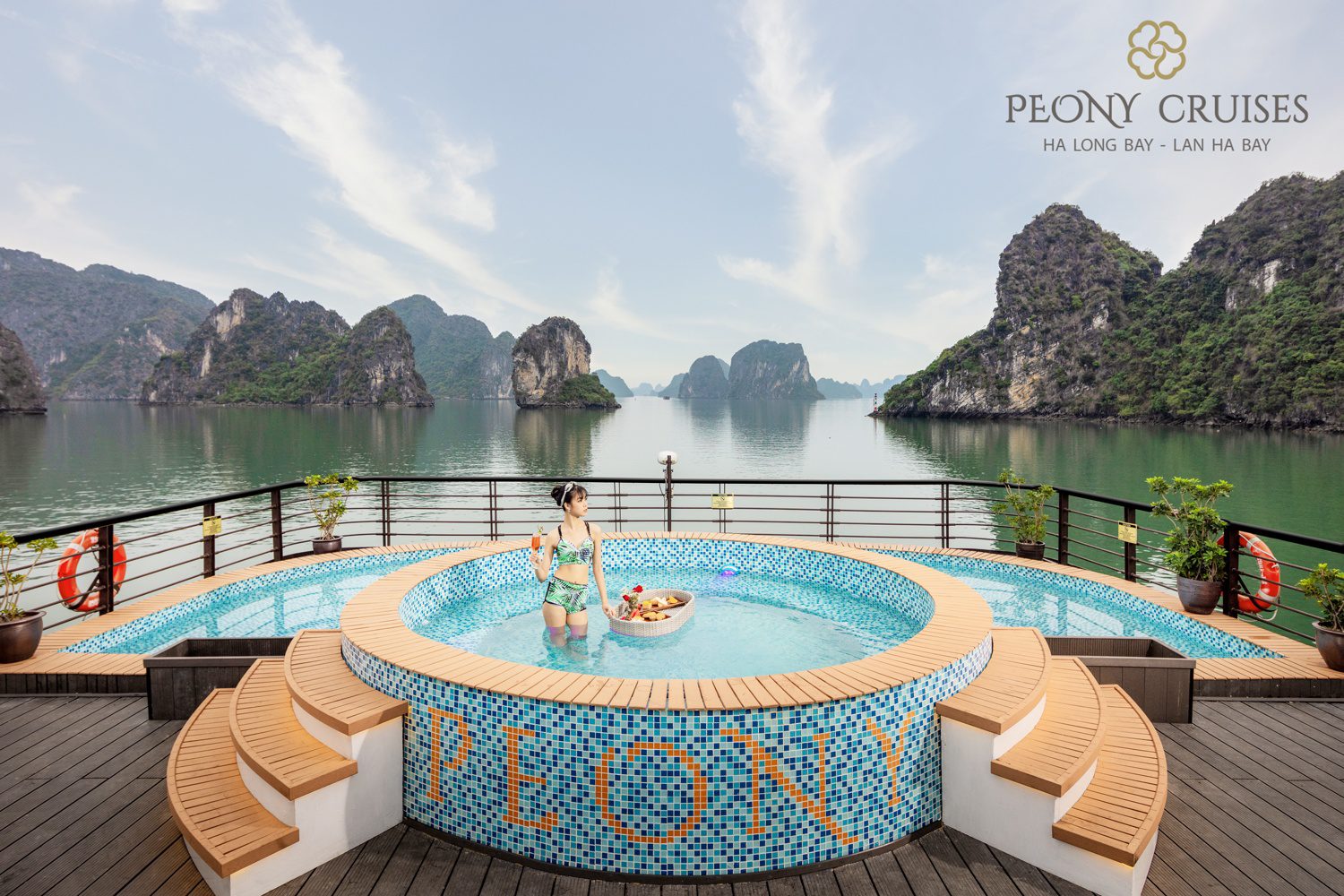 15:00: We will visit the Dark and Bright cave, famous for the pristine natural beauty and poetic, attractive seascape of Lan Ha Bay. Here you will take some photos of the romantic, lyrical local see-sights. This is also the best time for tourists to enjoin bamboo boat or kayaking which is an interesting activity to discover the truest beauty of the limestone mountains and the blue sky of Lan Ha Bay. Afterwards, visitors immerse in the emerald green water of Lan Ha Bay with exciting swimming activities or enjoy mini pool with jacuzzi on Peony Cruise.