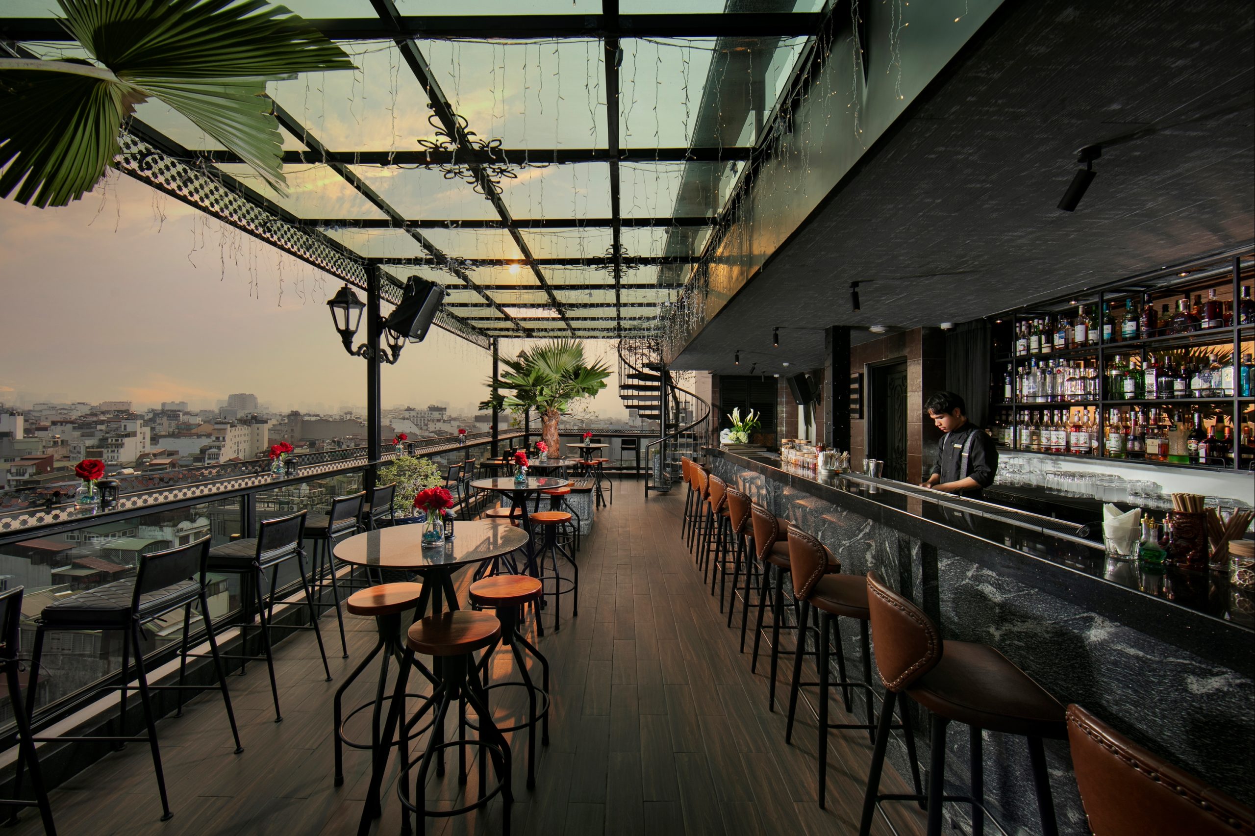 Một cầu thang xoắn ốc dẫn bạn lên tầng 11 – một không gian hoàn toàn mở, nơi bạn thực sự cảm thấy mình đang đứng trên đỉnh của thế giới Khu Phố Cổ.